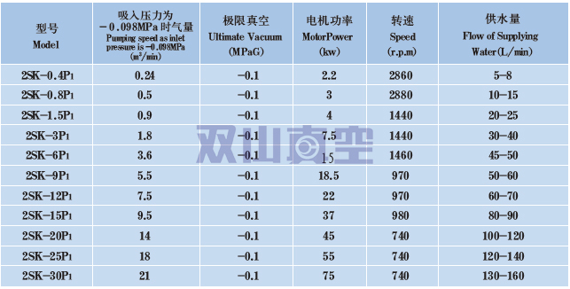 該類真空機組是由2SK系列兩級水環(huán)真空泵在吸入口加裝大氣泵組成,最低吸入壓力可達(dá)0.5~1kPa(A),在吸入壓力為1 ~ 6kPa(A) 之間仍有較大抽速,因此適合于在較高真空下工作。